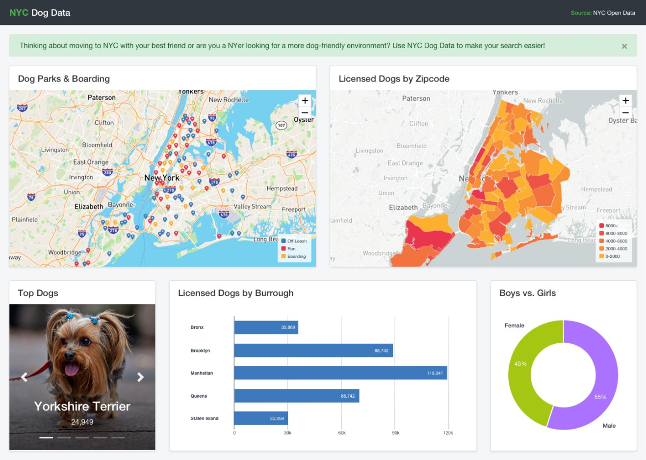 • A choropleth map that displays the amount of licensed dogs by Zip Code when the user hovers over a zip code.